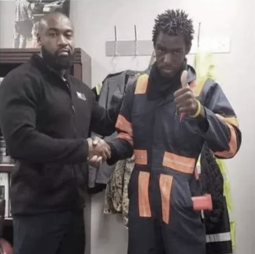 The photo shows him receiving recognition—shaking hands with what appears to be a supervisor or manager, both men standing in what looks like an office. The young man wears his work uniform—a high-visibility vest with orange and yellow stripes over dark clothing—and holds what might be paperwork or a certificate. His expression is serious, focused, maybe still not quite believing this is real.