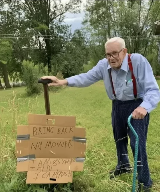 So he made a cardboard sign and stood by his lawn: “Bring back my mower. I’m 85 I can’t push!”